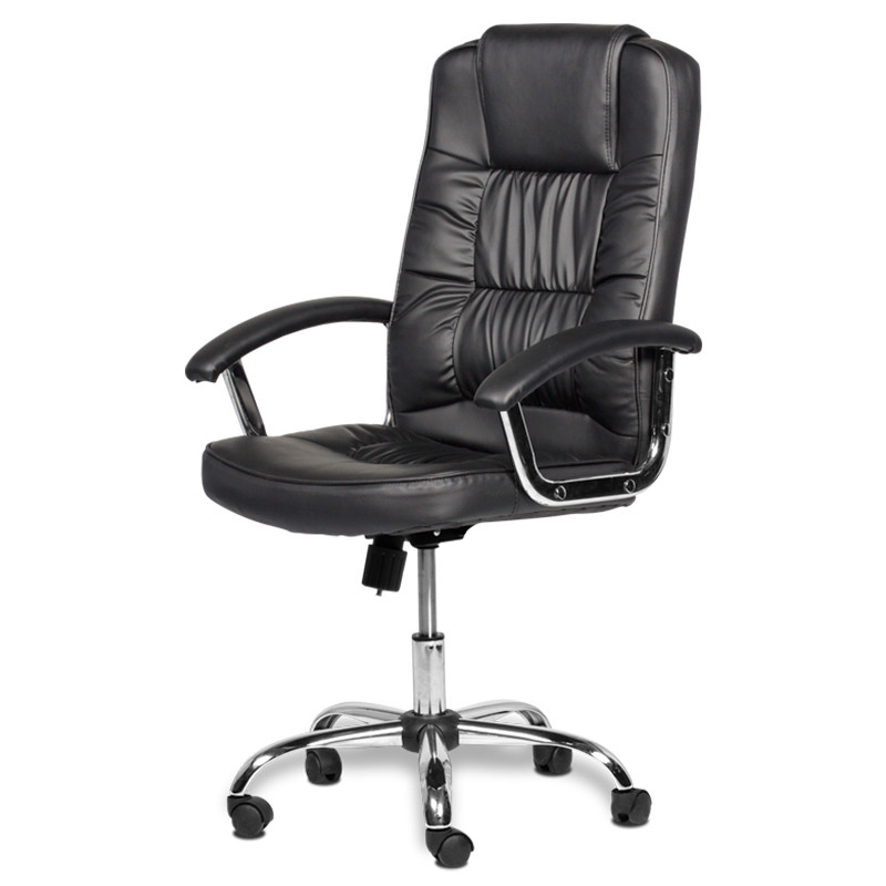 Директорски стол с практична облегалка и ергономична седалка. Изработен е от мека черна еко кожа, със стабилна хромирана база и хромирани подлакътници. Функцията за коригиране на височината позволява нагласяне на стоящия в избрана от него позиция, а люлеещият механизъм дава възможност за релакс на работното място или в дома. Материал: еко кожа, серия FORMA / VIVID. База: хром. Подлакътници: еко кожа + хром. Газов амортисьор, коригиране височина, люлееща функция.Цвят: черен. Максимално натоварване до 130 кг. ,
