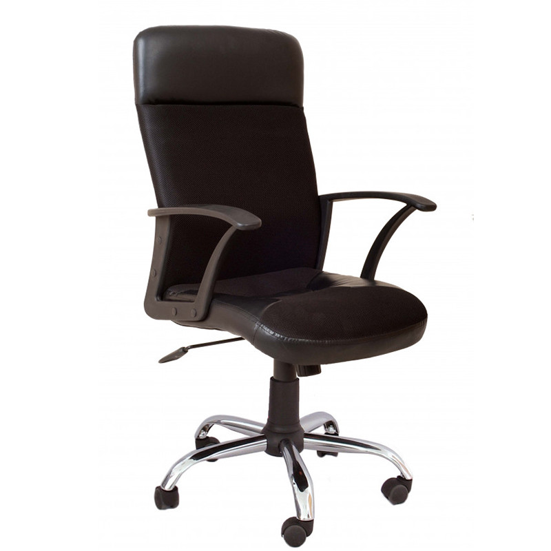 Директорски стол с ергономични седалка и облегалка, тапицирани в черна еко кожа в комбинация с мрежа. Разполага с полипропиленови подлакътници, метална хромирана основа, люлеещ механизъм със заключване в изходна позиция, регулиране на люлеенето според теглото на седящия.Гаранция: 24месеца Максимално тегло на потребителя (кг): 120