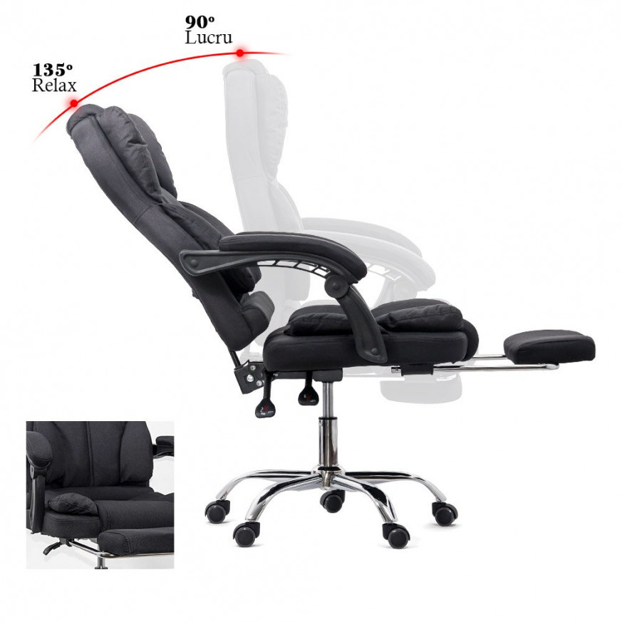 Седалката му е регулируема на височина, облегалката му е снабдена със система за сгъване и заключване - между 90 и 135 градуса.