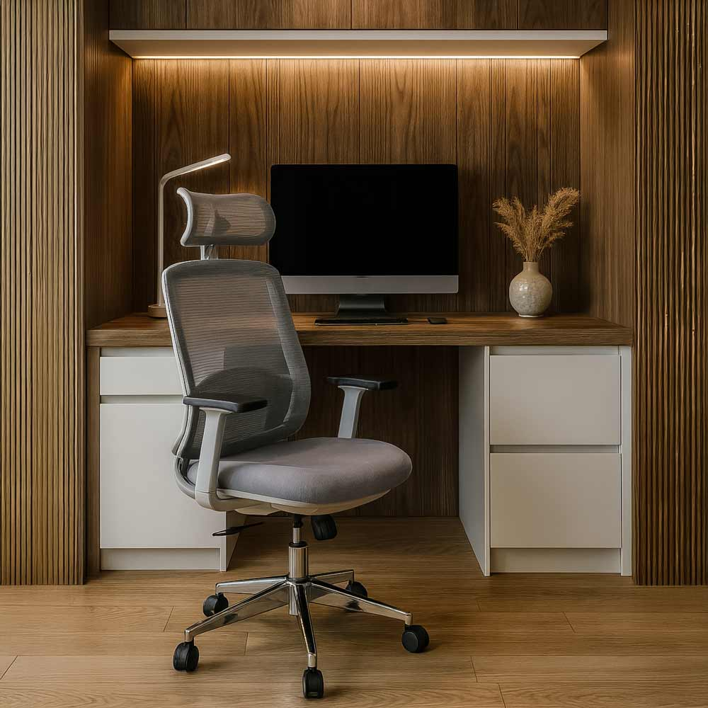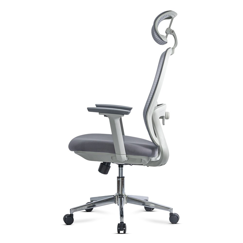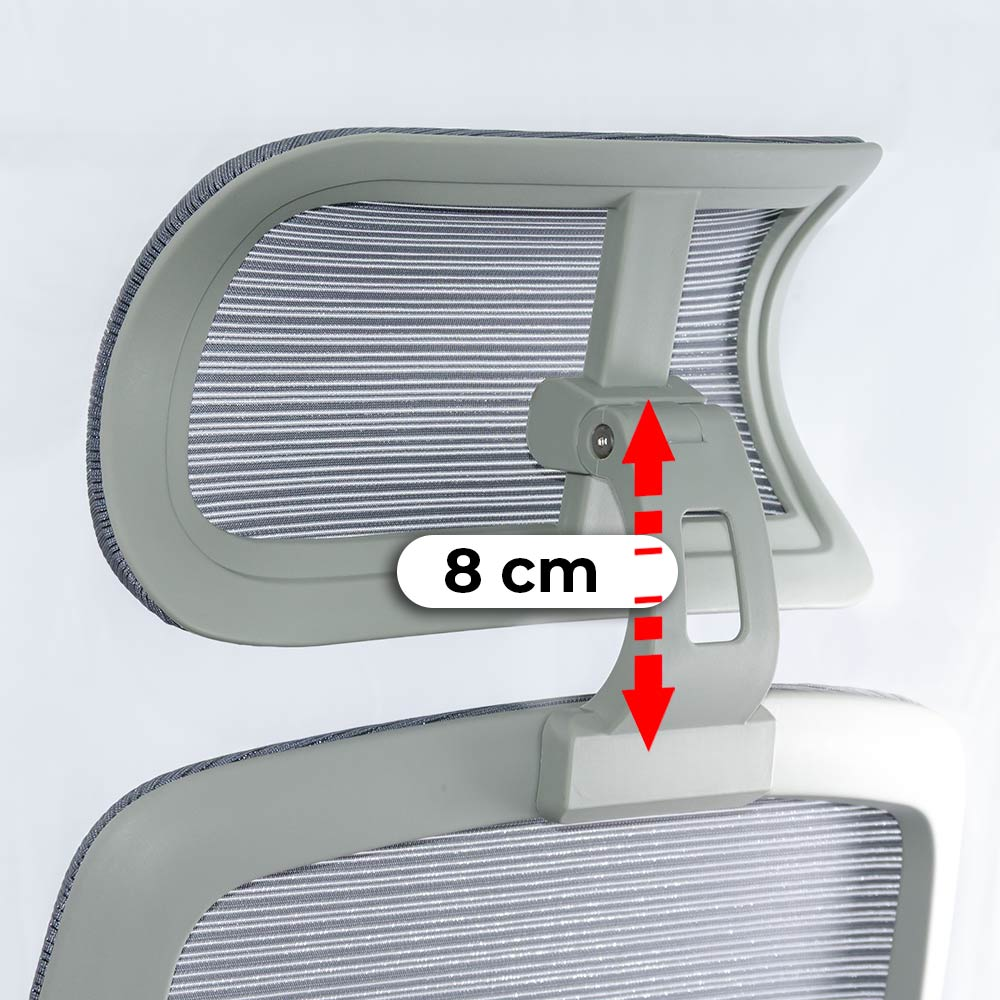Ергономичната облегалка от меш позволява добра циркулация на въздуха и лесно се адаптира към формата на гърба. Облегалката за глава е регулируема по височина (8 см) и наклон, осигурявайки удобна подкрепа за врата и главата. Седалката е изработена от мек дамаска.