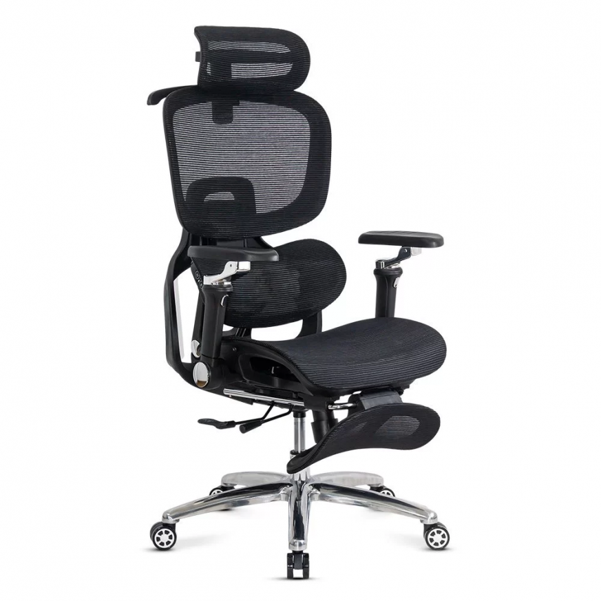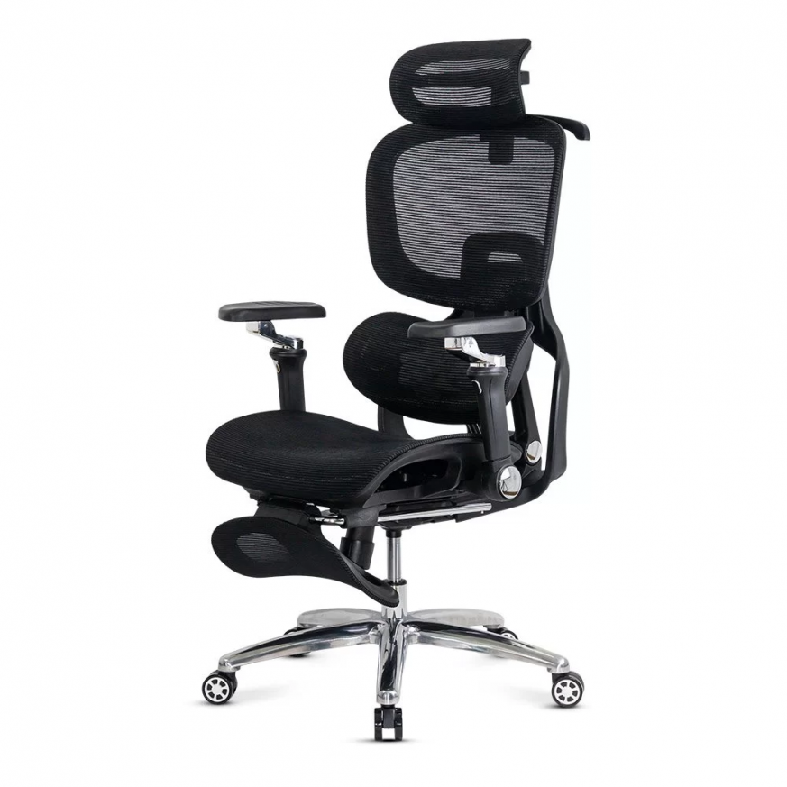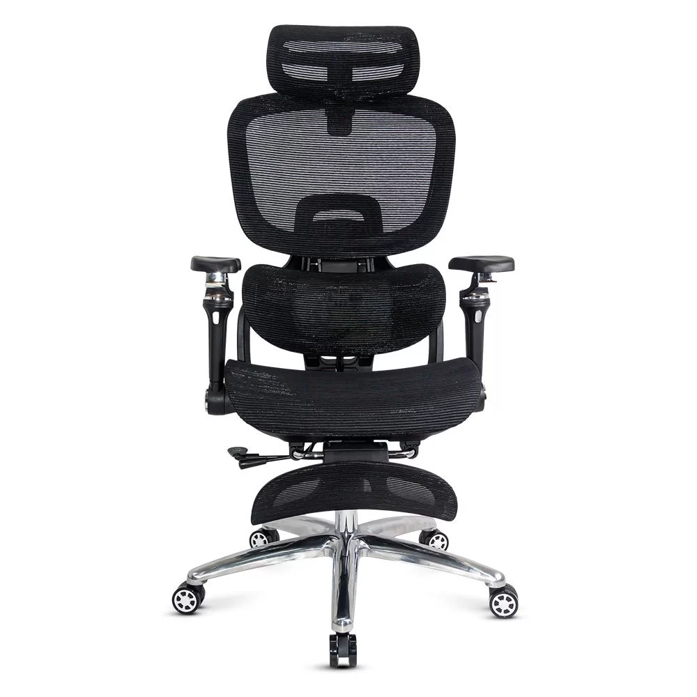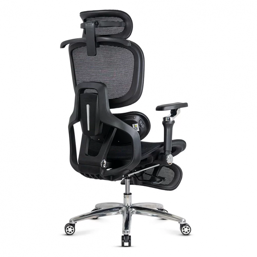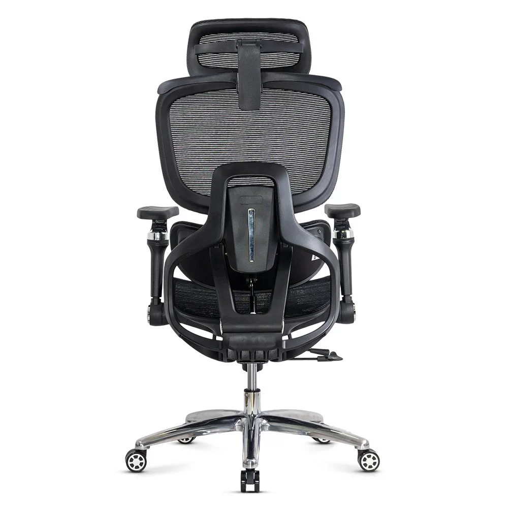Облегалката е изработена от дишаща мрежа , регулируема по височина (~5 см) и накланяща се до 135 градуса , а облегалката за глава, регулируема по височина и ъгъл (~8 см и 90 градуса), осигурява допълнителна опора за врата. Подлакътниците са напълно регулируеми: нагоре-надолу (~6 см), напред-назад, настрани, с интелигентно завъртане и накланяне. Хромираната метална основа и гумираните колела осигуряват стабилност и защита на пода.