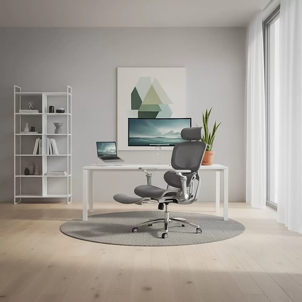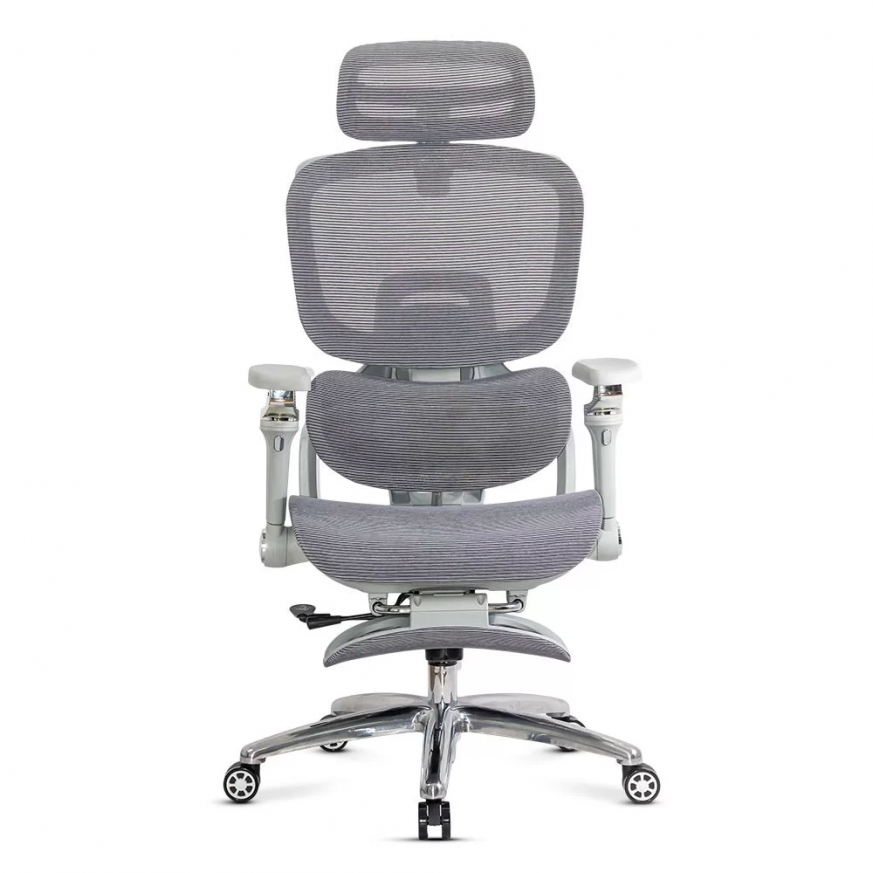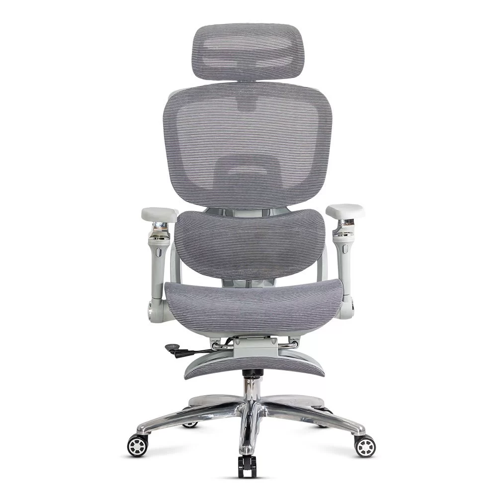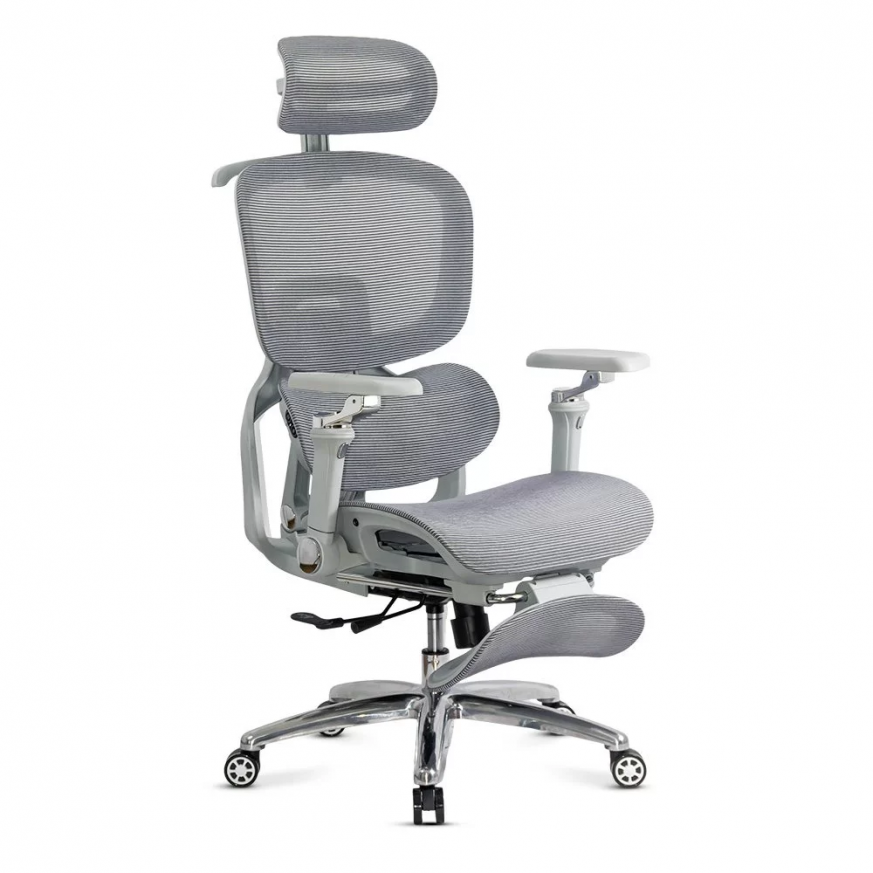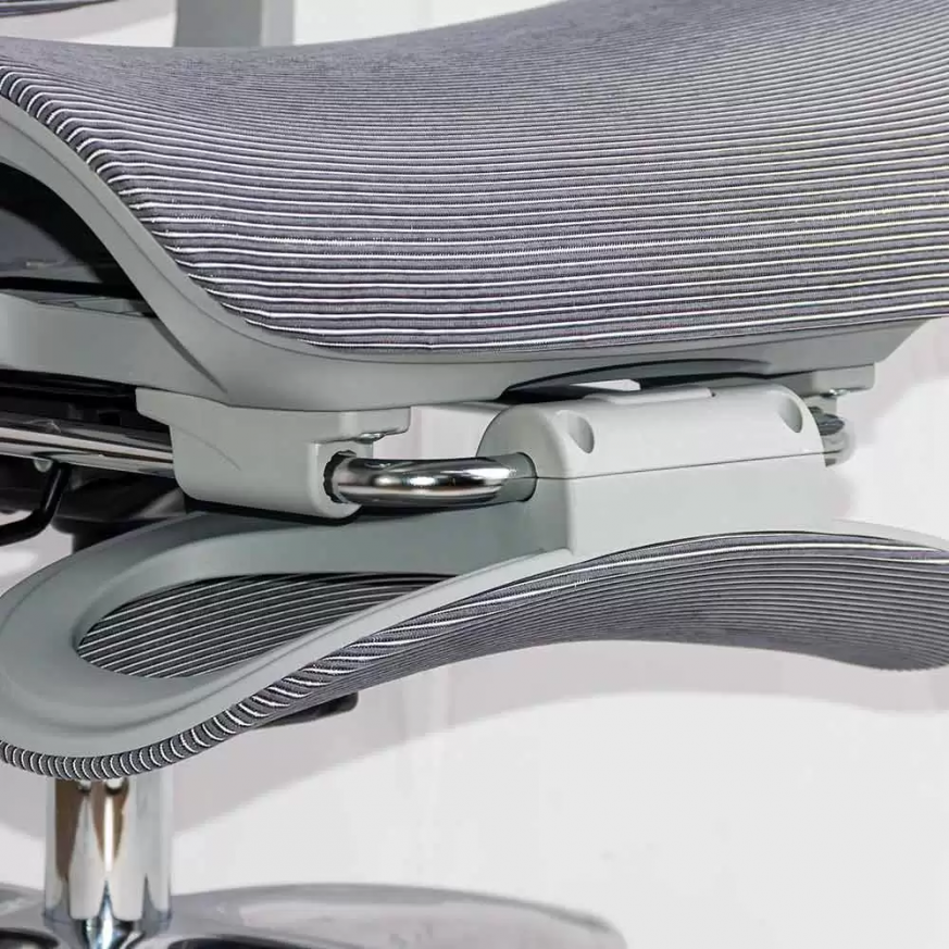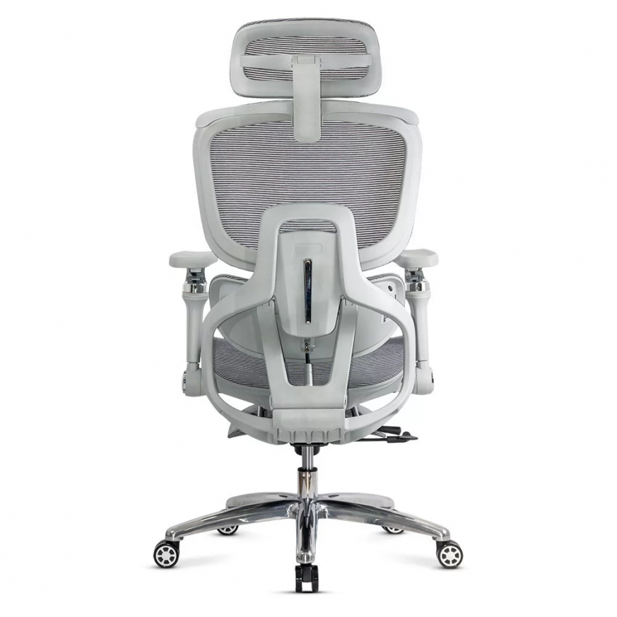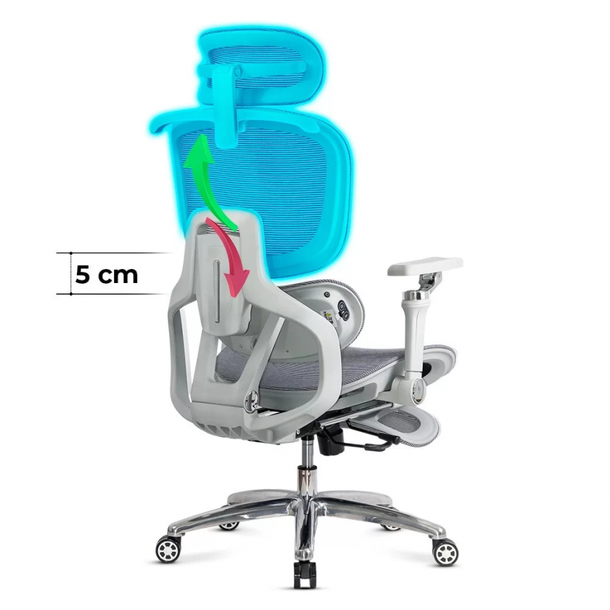 Облегалката е изработена от дишаща мрежа , регулируема по височина (~5 см) и накланяща се до 135 градуса , а облегалката за глава, регулируема по височина и ъгъл (~8 см и 90 градуса), осигурява допълнителна опора за врата. Подлакътниците са напълно регулируеми: нагоре-надолу (~6 см), напред-назад, настрани, с интелигентно завъртане и накланяне. Хромираната метална основа и гумираните колела осигуряват стабилност и защита на пода.