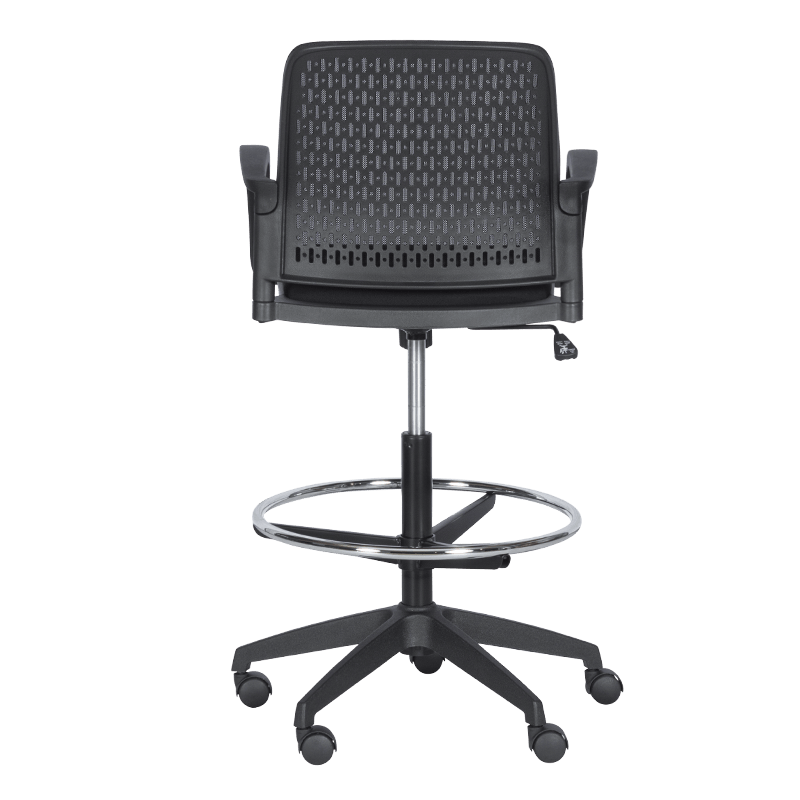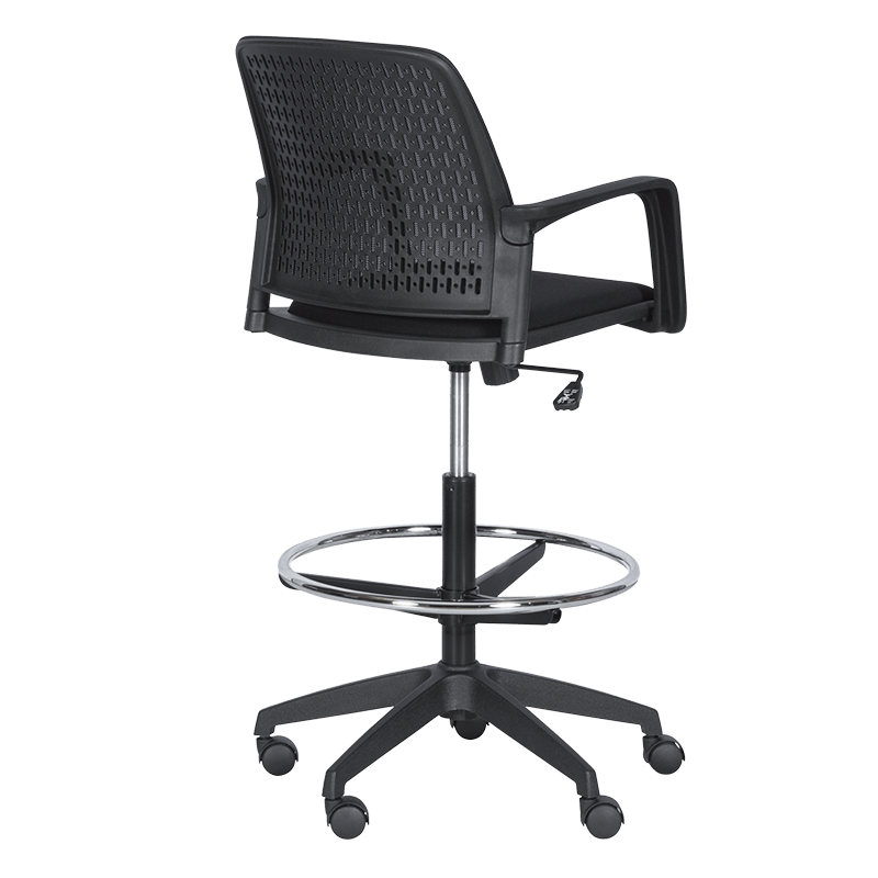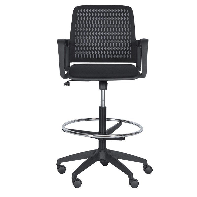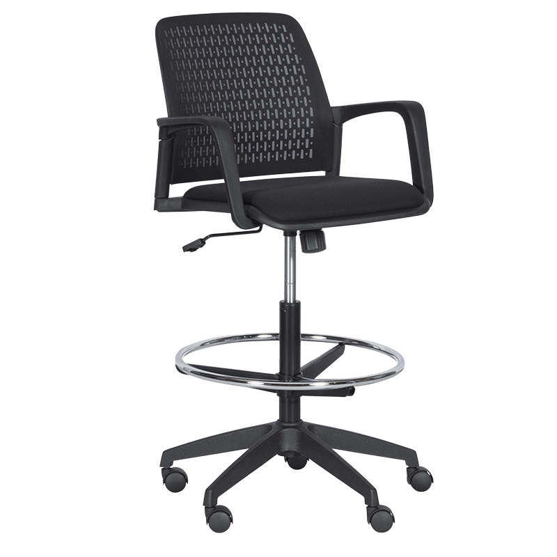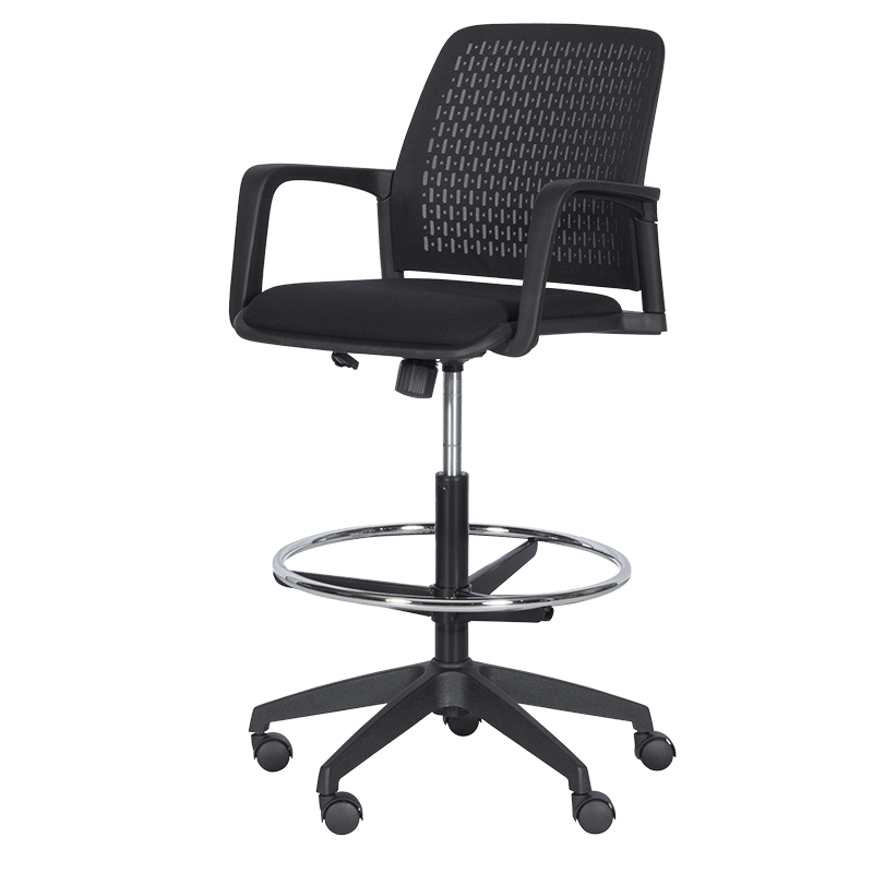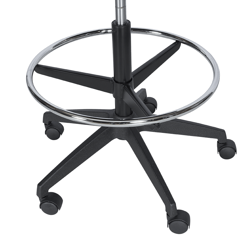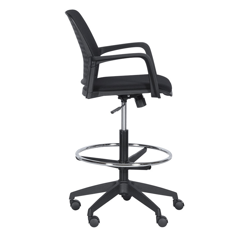 Работен офис стол 7556 комбинира функционалност и комфорт. Благодарение на регулируемата си височина и хромирана степенка тип ринг, той може да се използва както като обикновен офис стол, така и като висок работен стол. Степенката осигурява удобна опора за краката и предпазва от неприятното усещане за „висящи“ крака при по-висока позиция на седалката. Седалката е тапицирана с дамаска, а облегалката е изработена от полипропилен с мрежеста структура за по-добра вентилация и циркулация на въздуха.