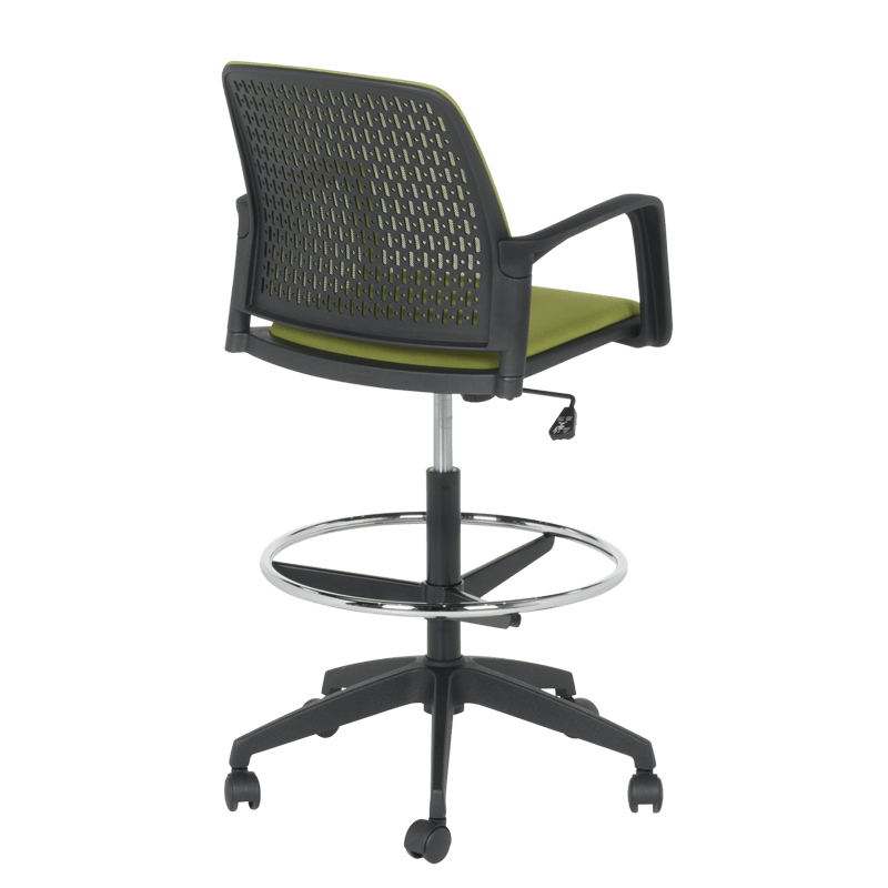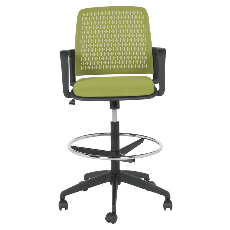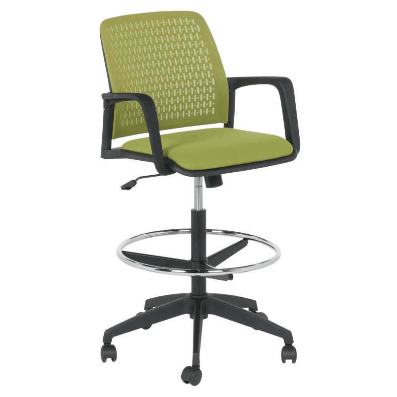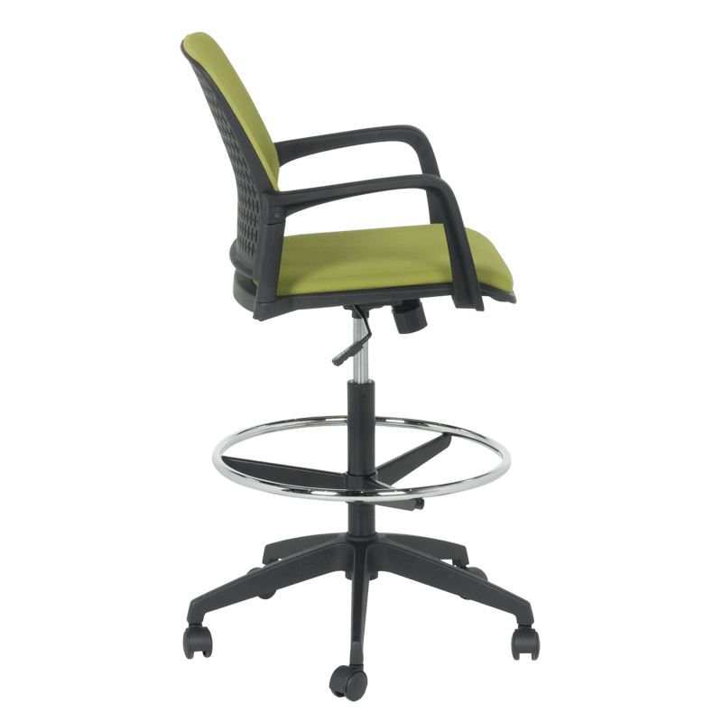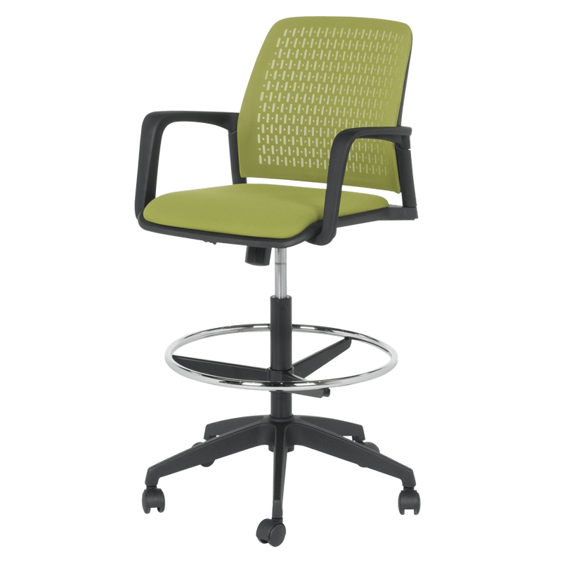 Работен офис стол 7556 комбинира функционалност и комфорт. Благодарение на регулируемата си височина и хромирана степенка тип ринг, той може да се използва както като обикновен офис стол, така и като висок работен стол. Степенката осигурява удобна опора за краката и предпазва от неприятното усещане за „висящи“ крака при по-висока позиция на седалката. Седалката е тапицирана с дамаска, а облегалката е изработена от полипропилен с мрежеста структура за по-добра вентилация и циркулация на въздуха.