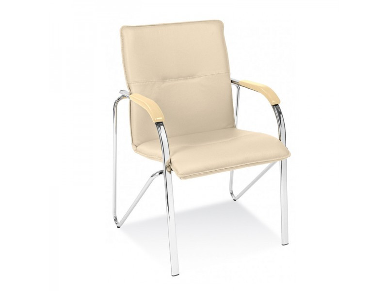 Samba е един от най - търсените модели посетителски и конферентни столове. И не е случайно. Така е, защото предлага удобство дори и при продължително седене. Едновременно с това може спокойно да се комбинира с повечето модели столове с хромирани елементи. Стилен посетителски стол, изработен от висококачествена еко кожа. Оборудван със здрава метална хромирана рамка, подлакътници с дървени падове в цвят бук, стифиране до 3 броя. Стол, подходящ за семинарна и конферентна зала, чакалня, за дома.