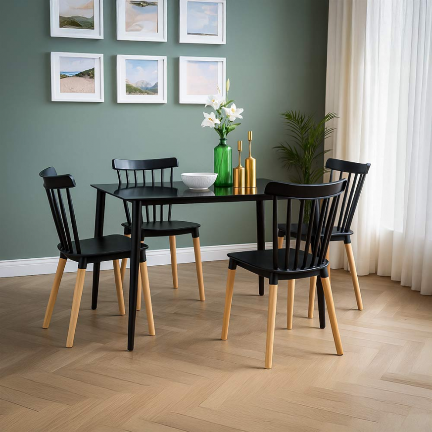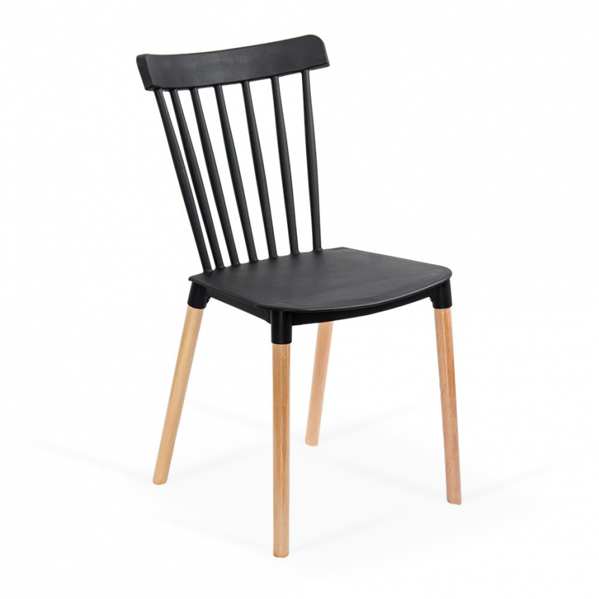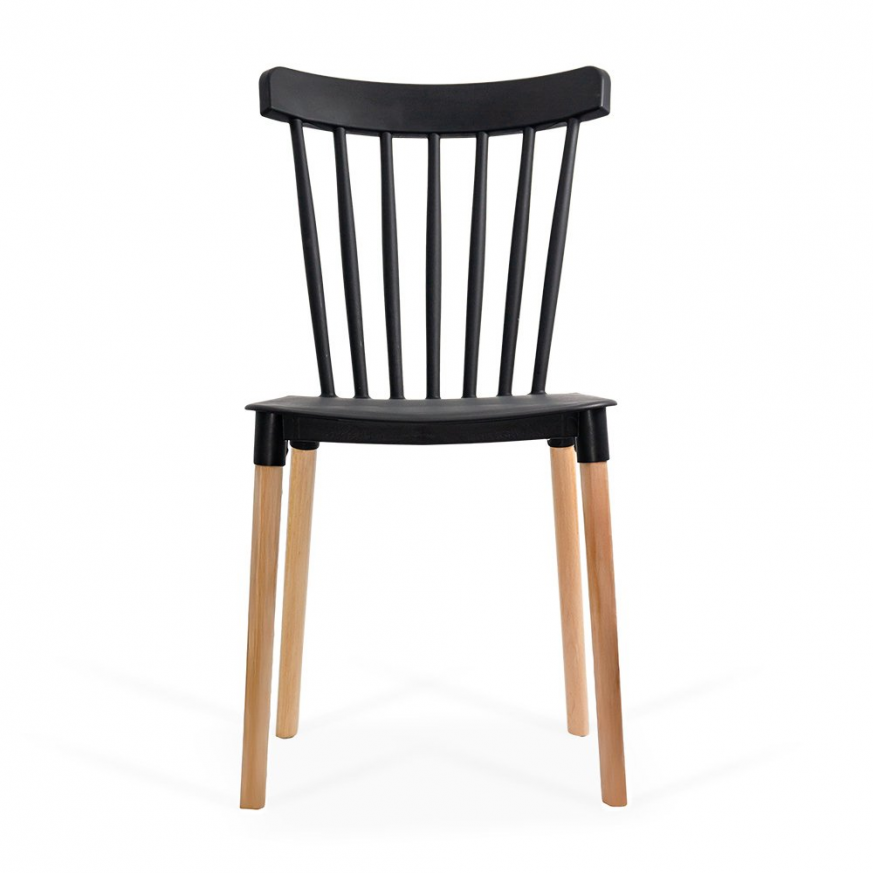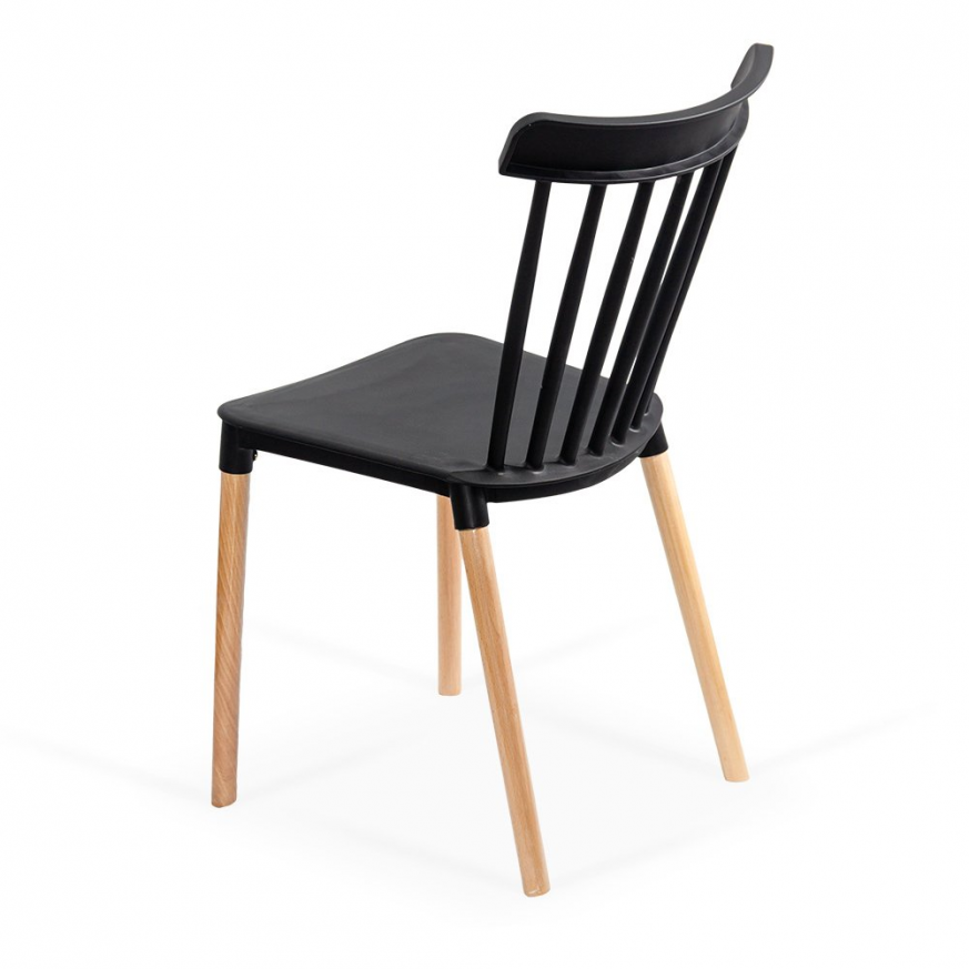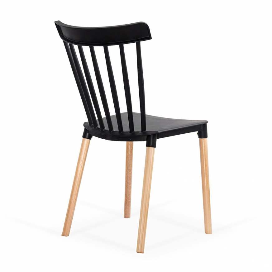 Краката са направени от естествено дърво, което добавя приятен контраст и топъл акцент. Този модел е подходящ както за домашна употреба, така и за кафенета, тераси или ресторанти, които търсят мебели, съчетаващи лекота, стабилност и стилен външен вид.