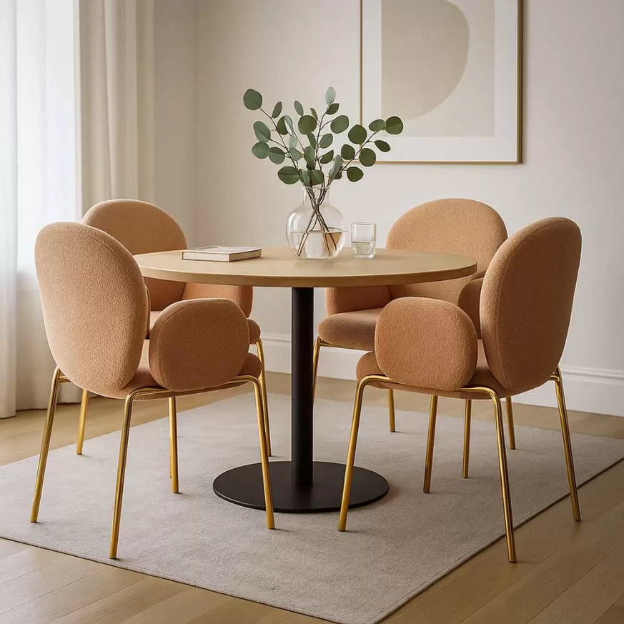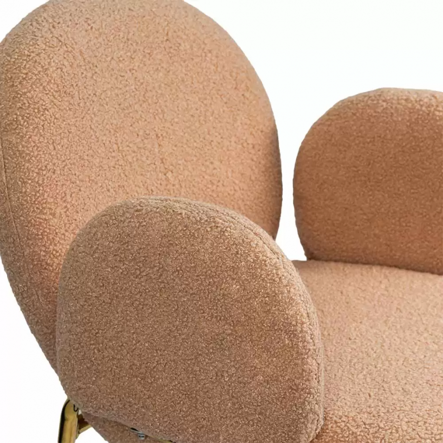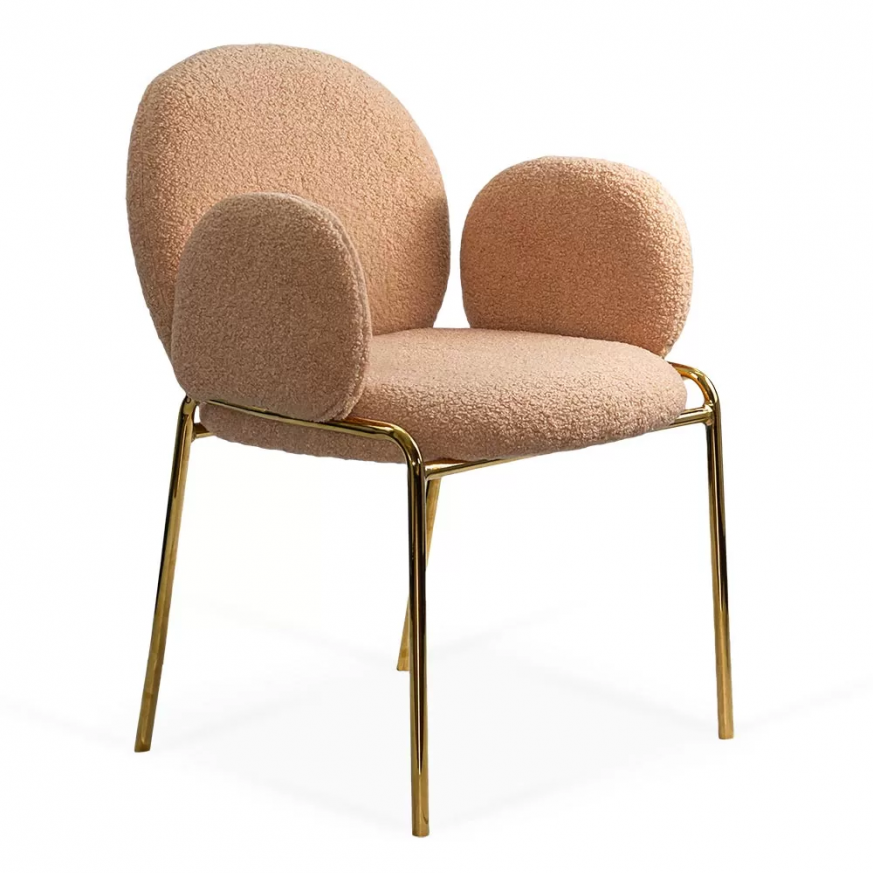 Tрапезен стол Samanta Gold е перфектният избор за тези, които ценят комфорта и изтънчеността. Със заоблена форма и мека тапицерия от букле, този стол добавя топлина и стил към всяка стая. Златистата метална рамка предлага нотка елегантност, а меките подлакътници допълват усещането за релаксация.